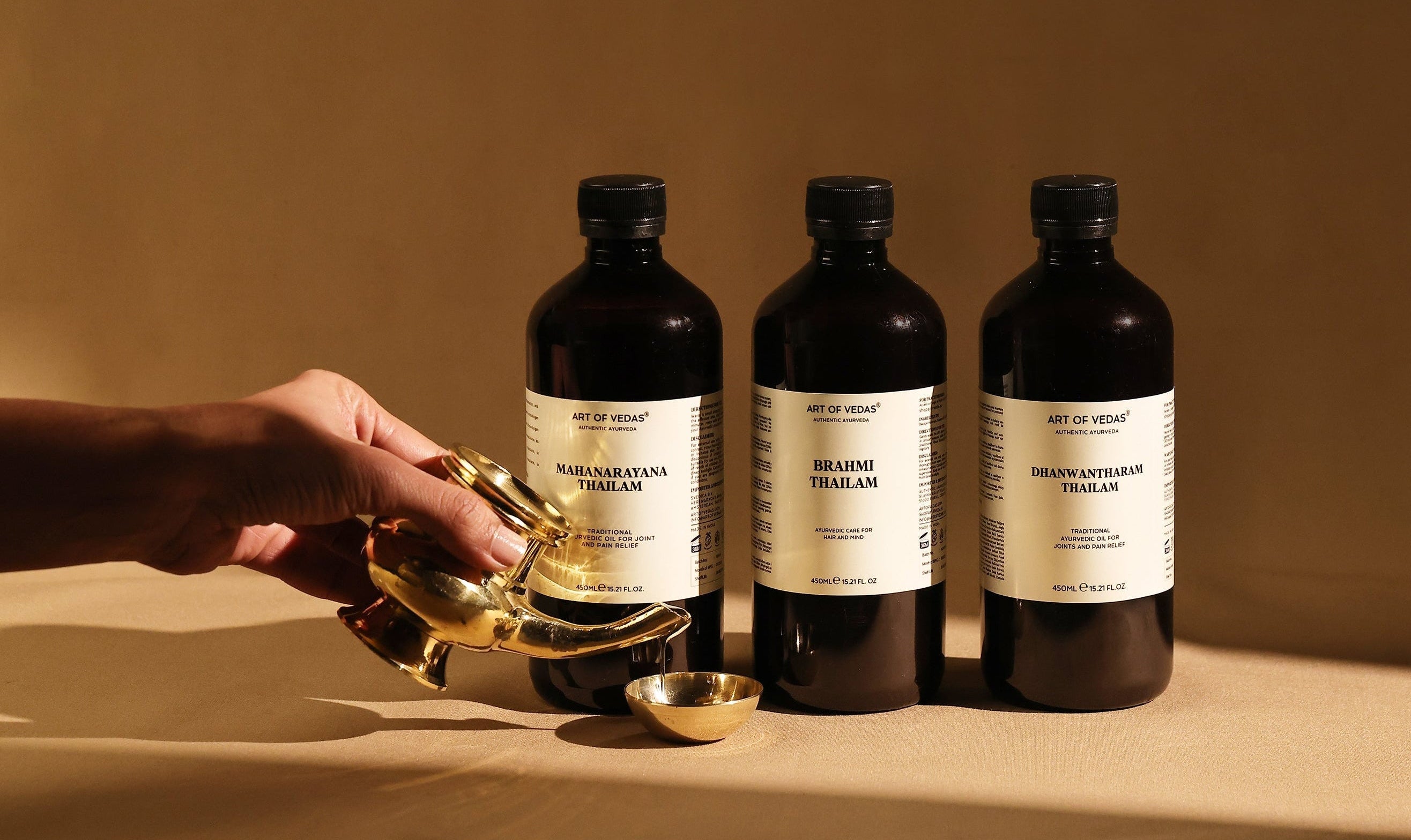 Meer dan 20 klassieke kruidenoliën voor Abhyanga, lichaamsverzorging, haarverzorging en dagelijkse Ayurvedic rituelen. Vind de juiste Thailam voor jou.