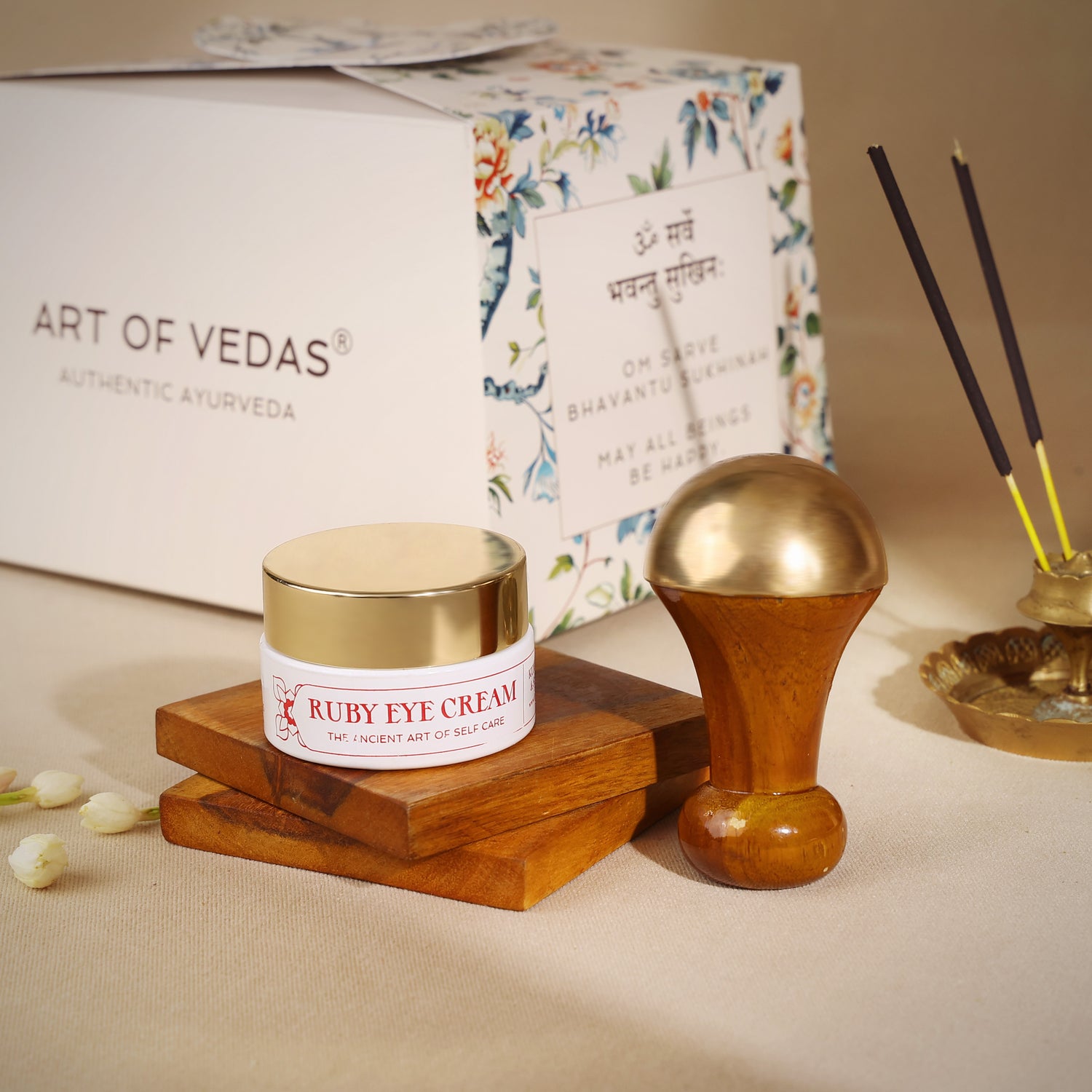 Unit price perExperience the Ayurvedic practice of Netra Abhyanga, a rejuvenating ritual for the delicate eye area, with the Kumkumadi Eye Care Kit. This kit includes the Ruby Eye Cream, a luxurious blend of saffron and Ayurvedic herbs to hydrate, brighten, and reduce the appearance of dark circles and fine lines, and the Mini Kansa Wand, designed for precise marma point massage to restore balance and enhance radiance.