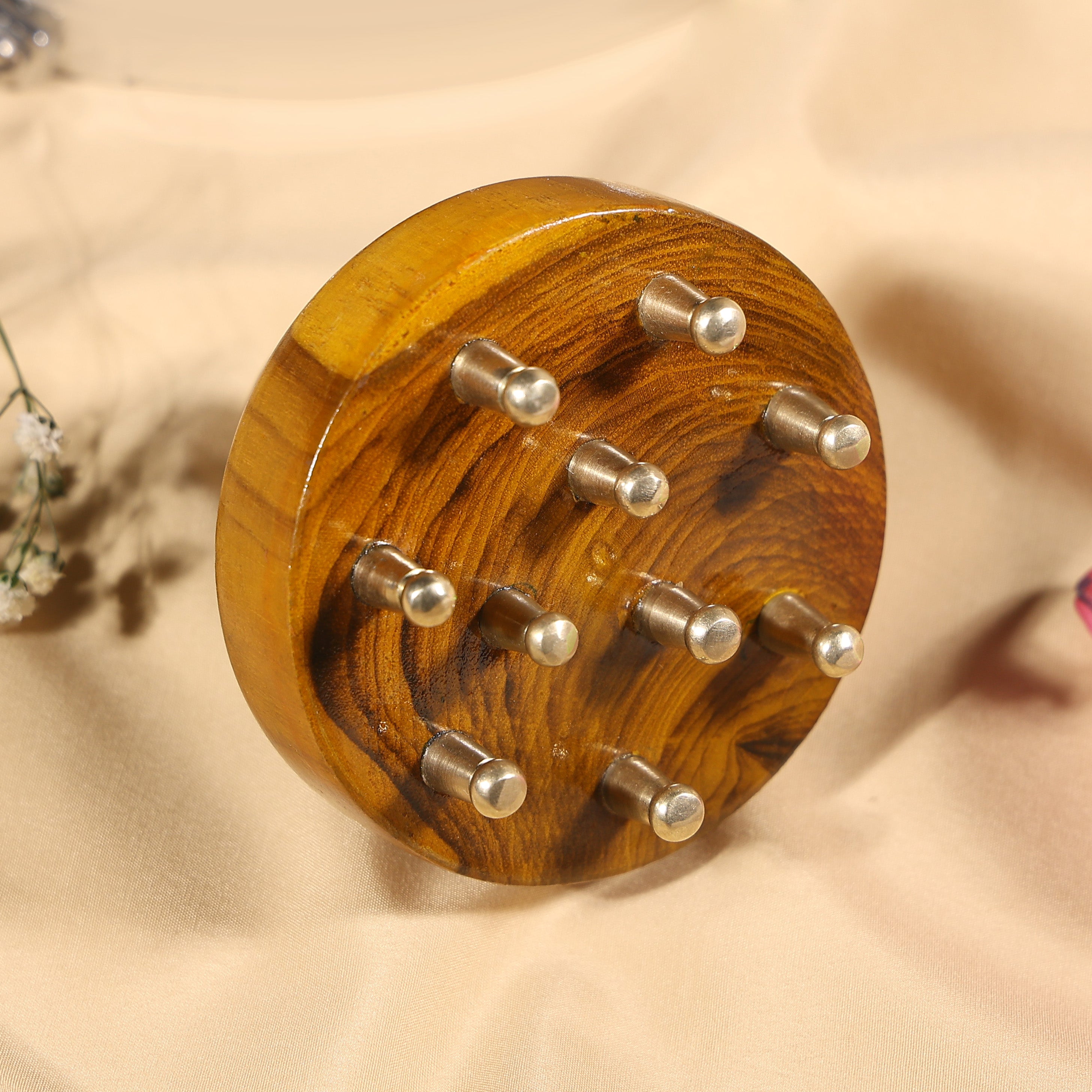 An Ayurvedic massage tool with smooth kansa-tipped nodes for Śiro Abhyanga (scalp massage) and targeted marma stimulation on the body. The cooling quality of kansa helps calm pitta, while rhythmic strokes support micro-circulation, lymphatic flow, and relaxation of the nervous system—grounding aggravated vata in muscles and fascia.