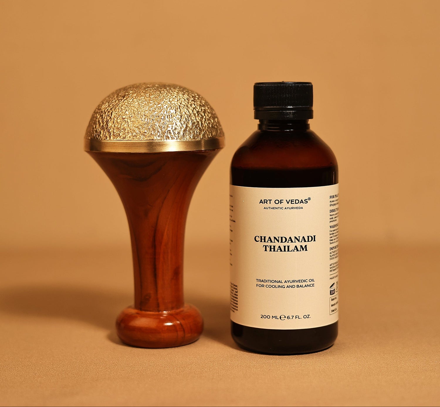 Le Kansa Vatki nécessite une couche généreuse d’huile tiède pour glisser sur la plante du pied sans friction. Le Dhanwantharam Thailam est le compagnon classique du Padabhyanga, réchauffant et équilibrant le Vata avec une nutrition profonde aux herbes qui pénètre la peau épaisse des pieds. L’huile de massage Vata offre une alternative plus légère et aromatique avec du patchouli et du cèdre pour un rituel apaisant en soirée.